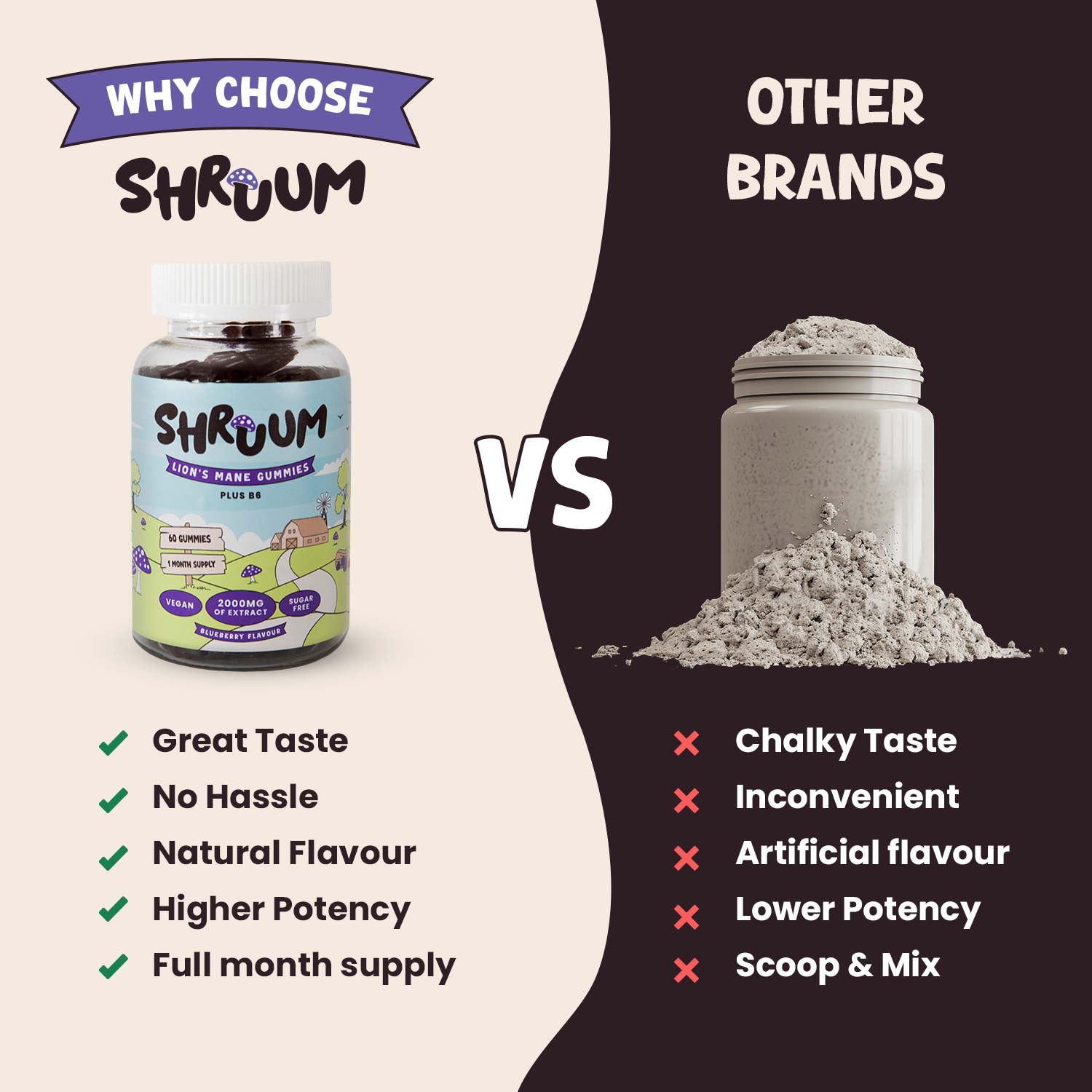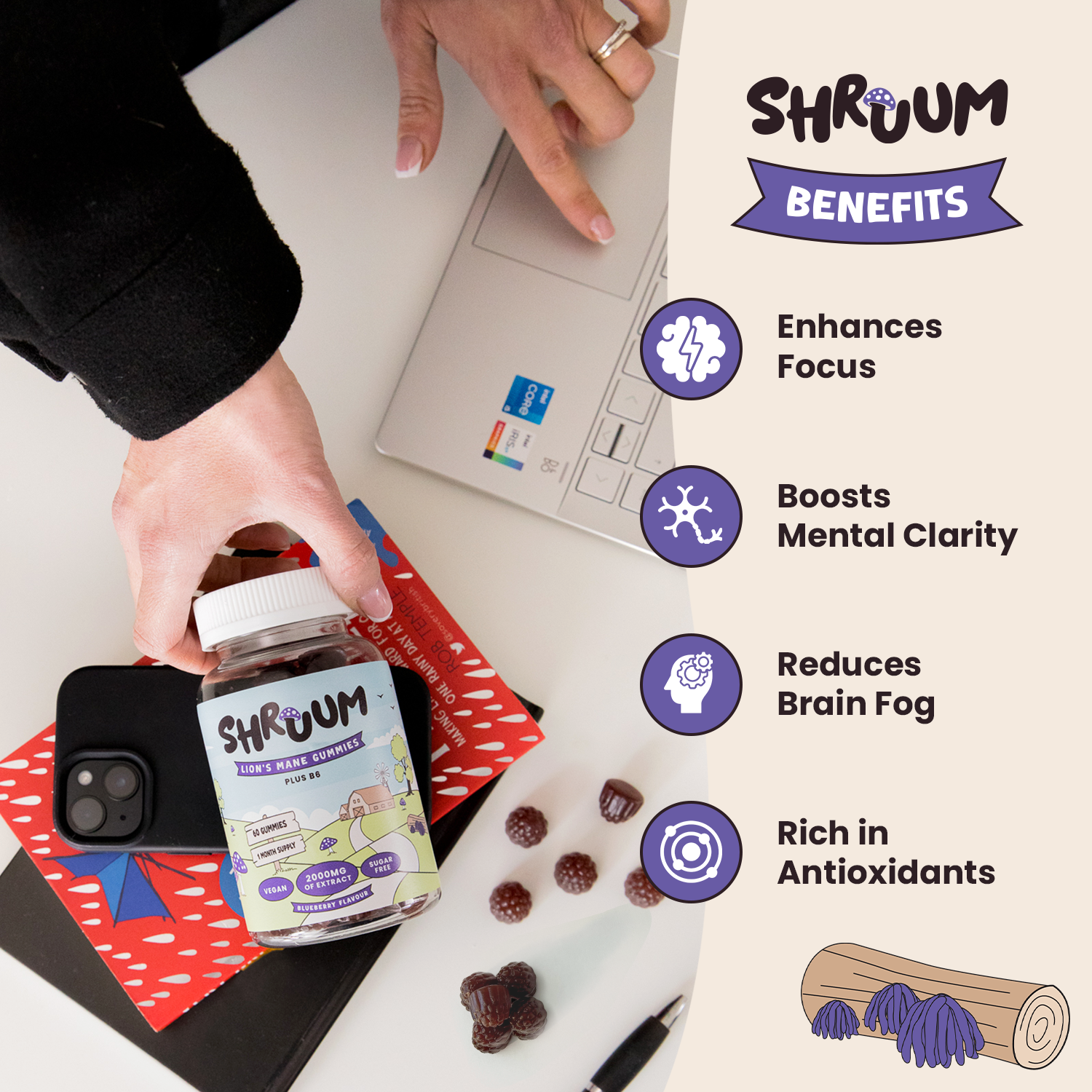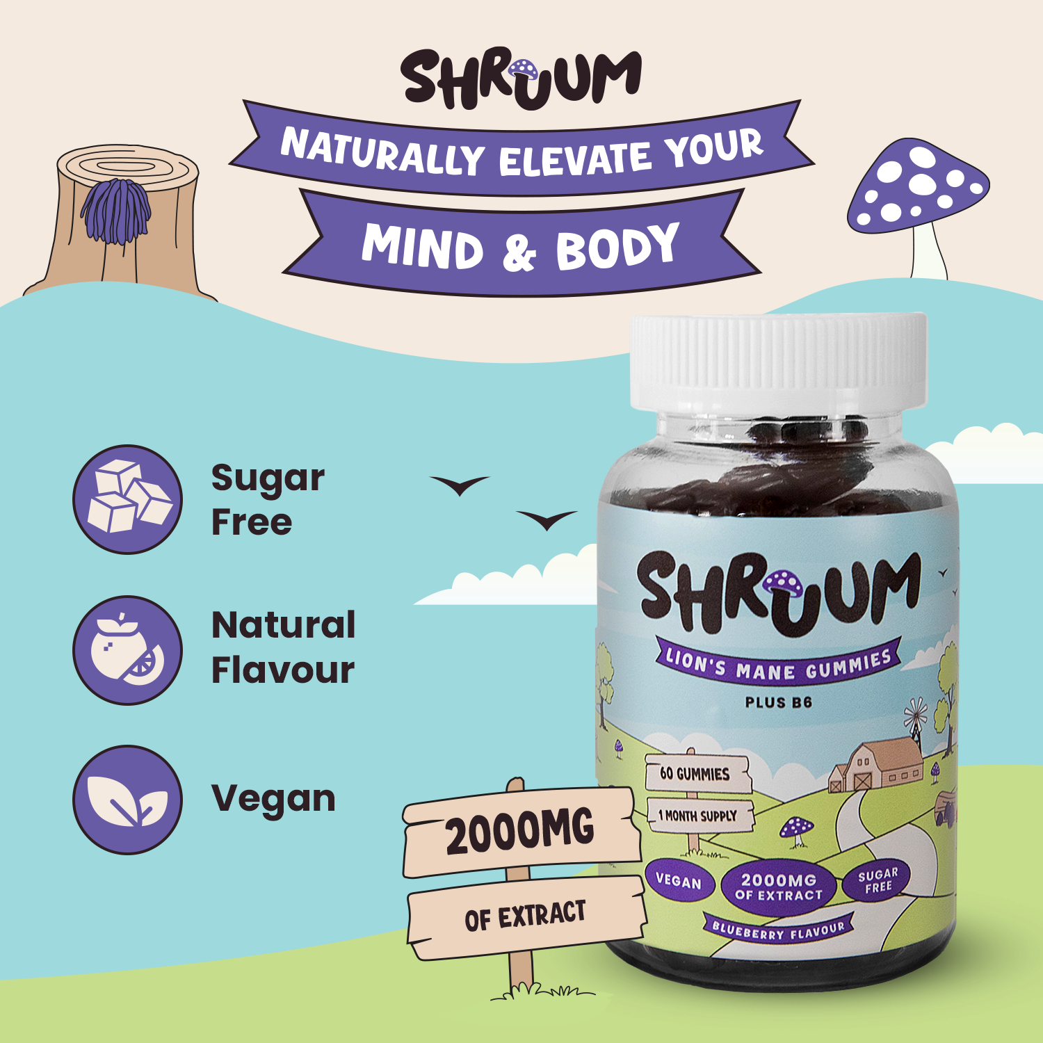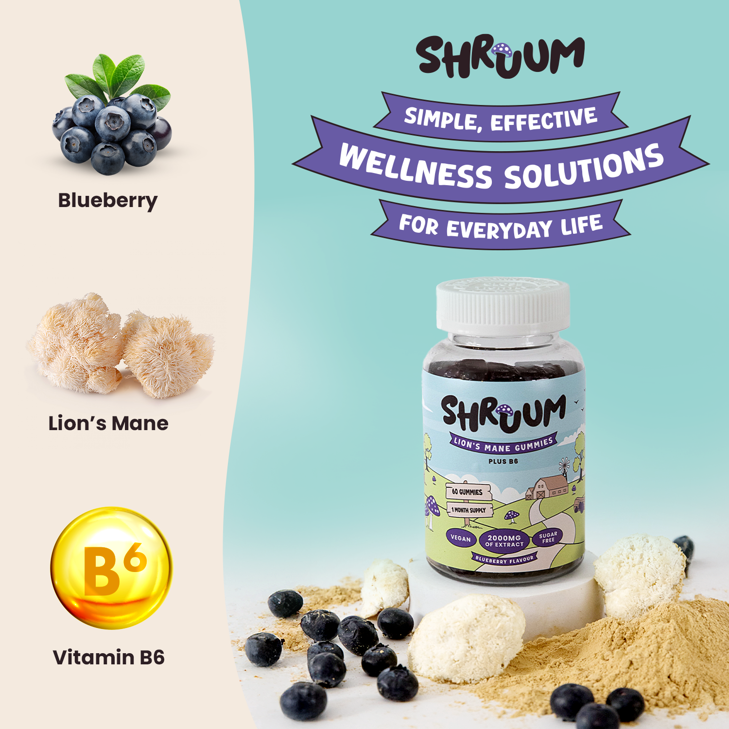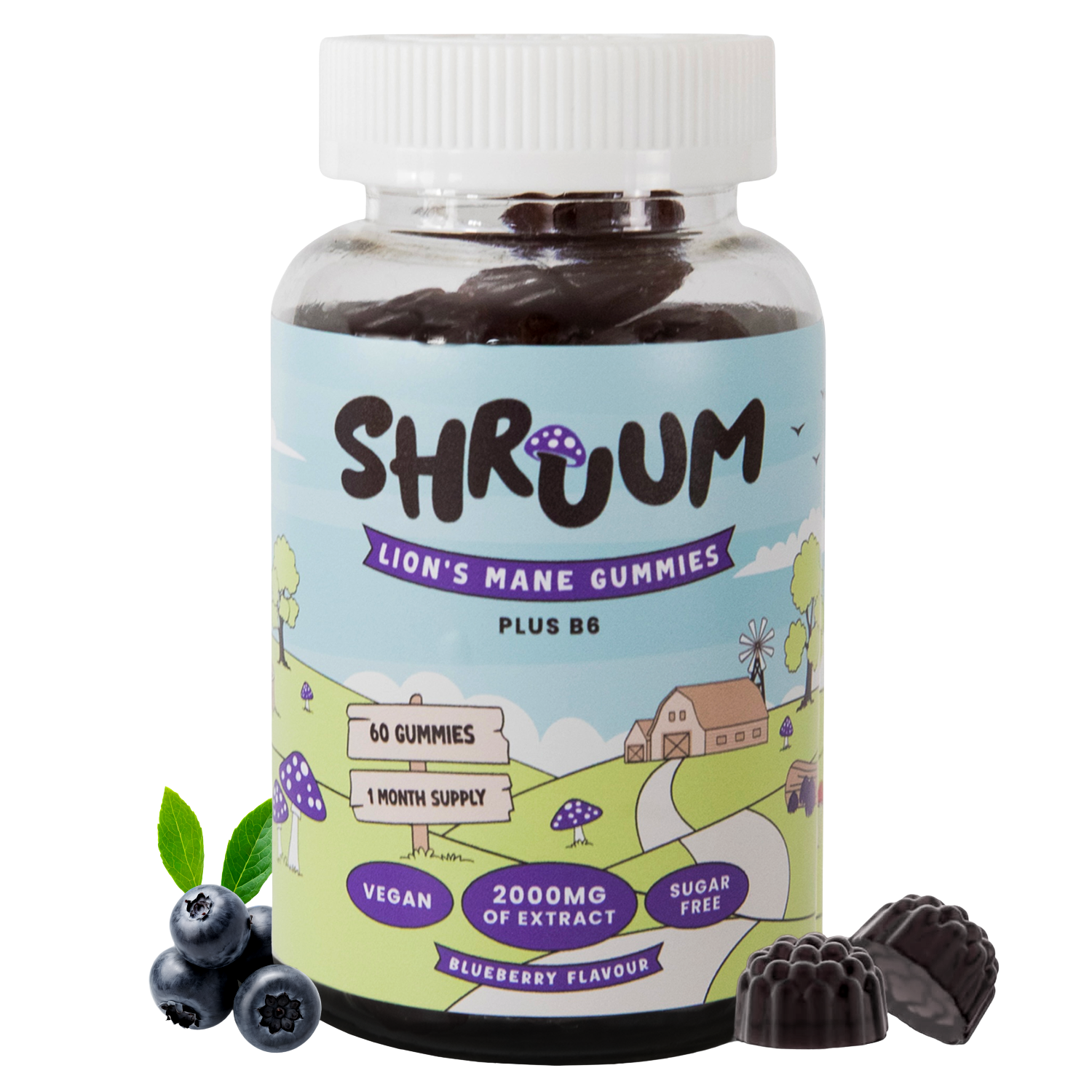 Shruum’s Lion’s Mane mushroom gummies are vegan, sugar-free, and boosted with Vitamin B6 to support clarity and focus. Unlike many brain supplements, they taste like real blueberries and are proudly UK-made for trusted quality.