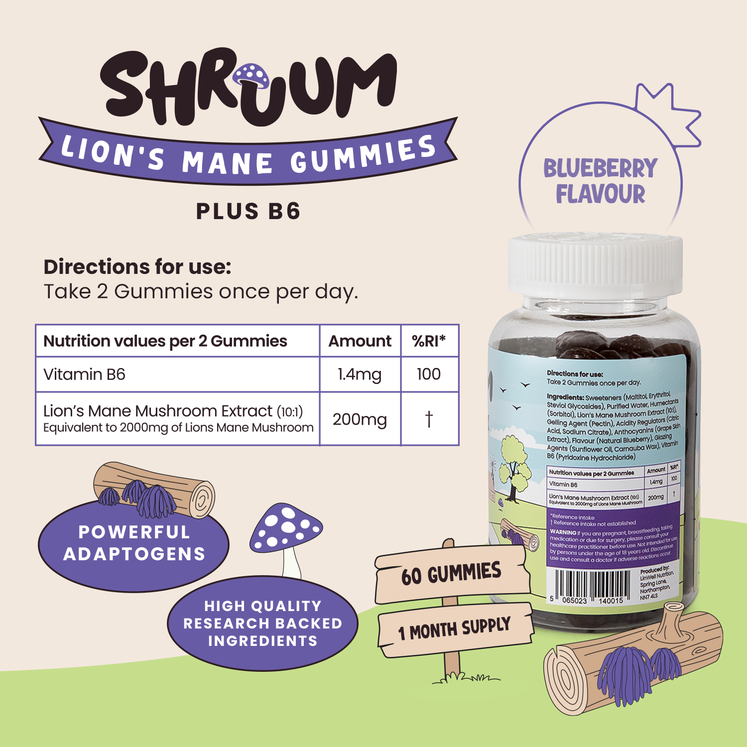 Shruum Lions Mane High Strength Mushroom Gummies (2000mg) - Vegan, Sugar-Free with Vitamin B6 for Focus & Clarity (Brain Health) - 60 Gummies, 30 Day Supply, Blueberry Flavour